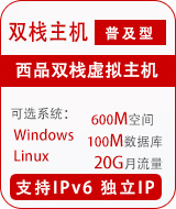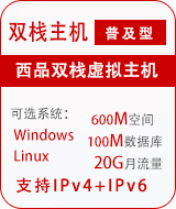 > 操作系统:Windows/Linux >双栈虚拟主机(IPv4+IPv6)共享IP > 网站空间:600M独立网页空间 > 支持ASP,ASP.NET,PHP,ACCESS动态程序开发 > 送100MB MYSQL5/MSSQL > 不限制连接数,20GB/月流量,绑定15个域名 > 控制面板 备案提交 备案提示