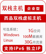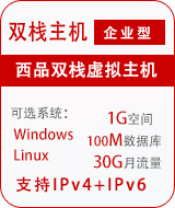 > 操作系统:Windows/Linux >双栈虚拟主机(IPv4+IPv6)双独立IP > 网站空间:1GB独立网页空间 > 支持ASP,ASP.NET,PHP,ACCESS动态程序开发 > 送100MB MYSQL5/MSSQL > 不限制连接数,30GB/月流量,绑定15个域名 > 控制面板 备案提交 备案提示