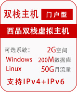 > 操作系统:Windows/Linux >双栈虚拟主机(IPv4+IPv6)共享IP > 网站空间:2GB独立网页空间 > 支持ASP,ASP.NET,PHP,ACCESS动态程序开发 > 送200MB MYSQL5/MSSQL,子目录3个 > 不限制连接数,50GB/月流量,绑定15个域名 > 控制面板 备案提交 备案提示